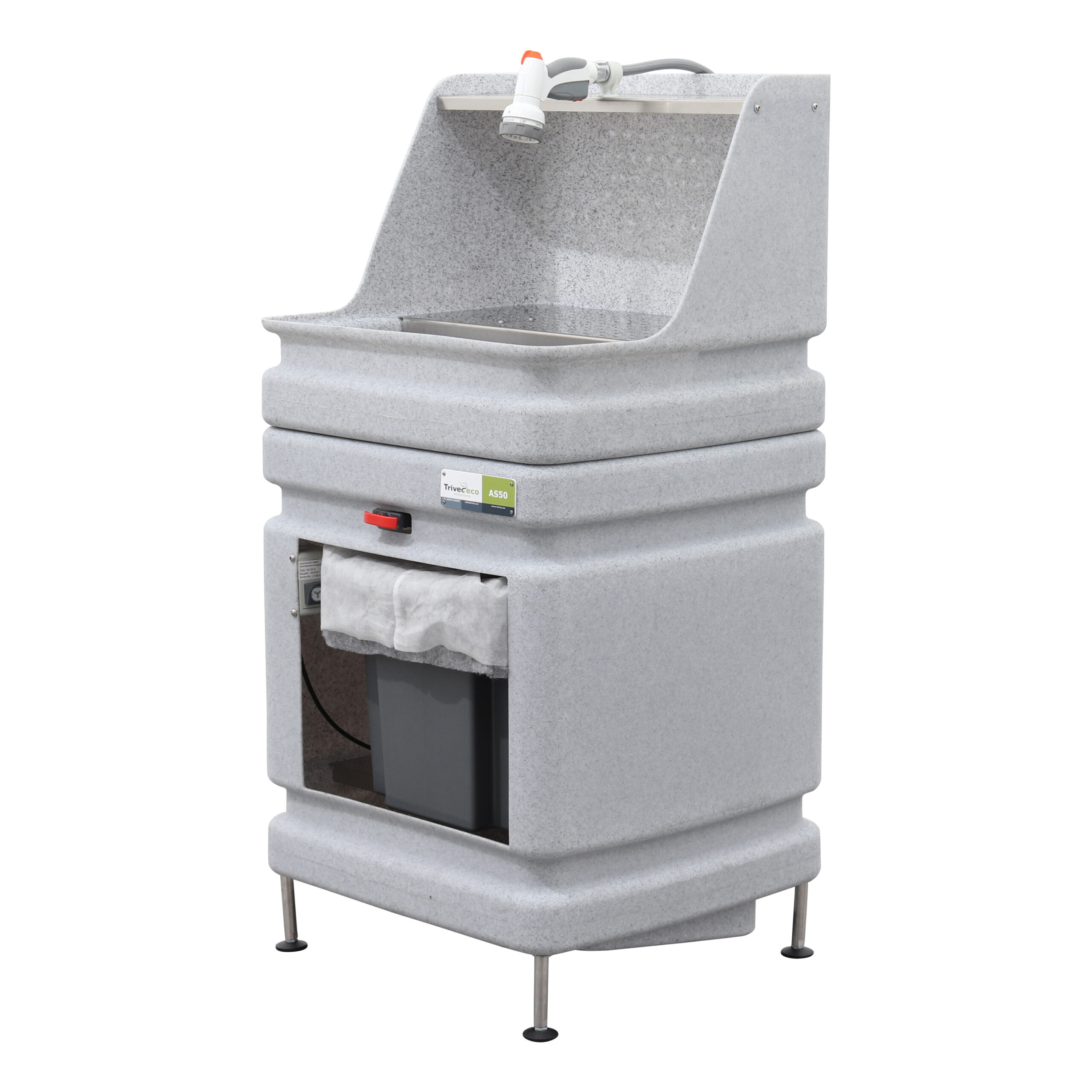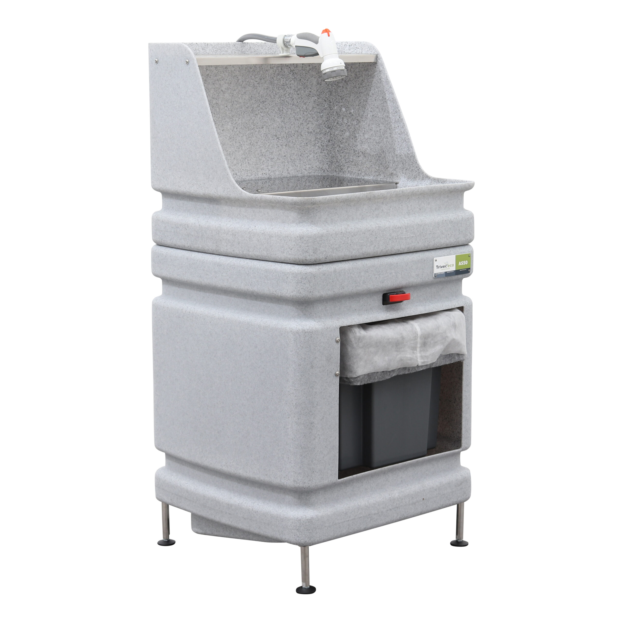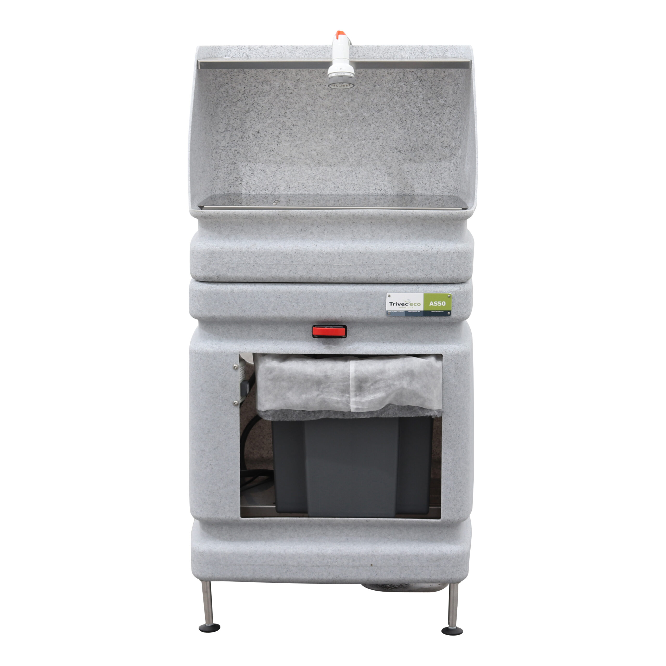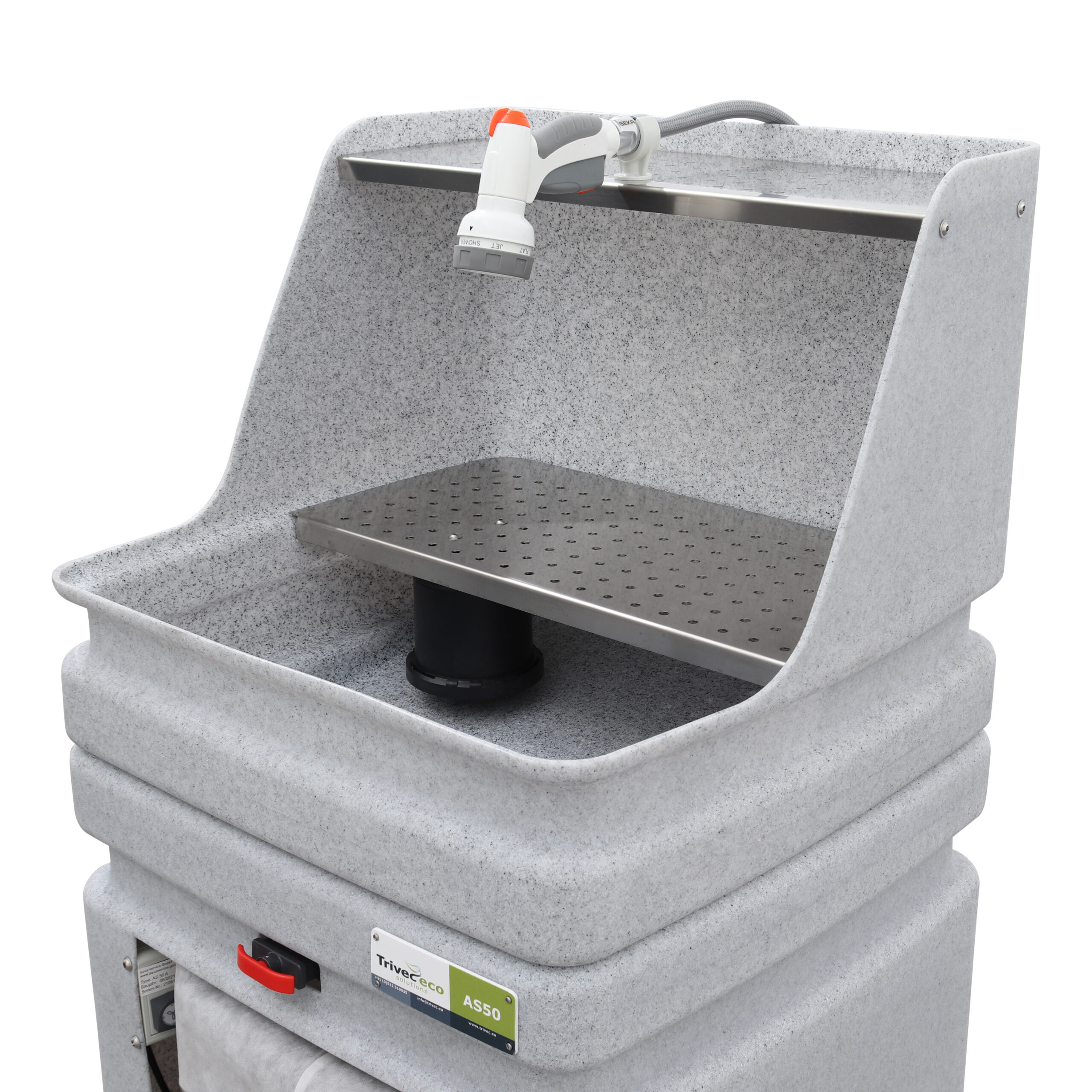 De AS50 A spoelwaterinstallatie heeft een capaciteit van 50 liter spoelwater en is uitgevoerd met een duurzame PE behuizing met geïntegreerde wastafel. De installatie werkt op een 230 V / 50 Hz aansluiting en heeft een procesduur van circa 20 minuten per zuiveringscyclus.