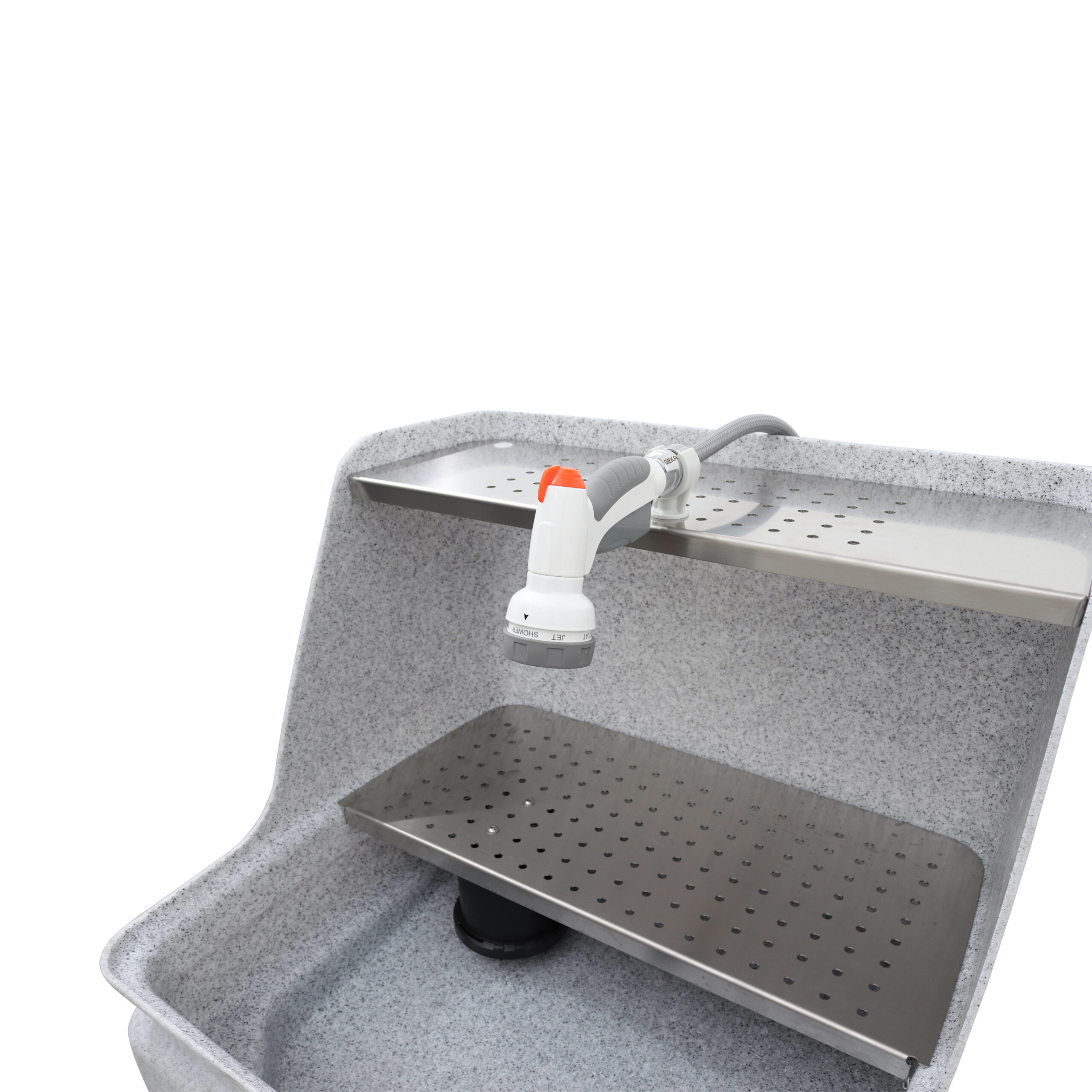 Het spoelwater wordt tijdens het reinigen van gereedschappen opgevangen in de geïntegreerde wastafel. Met één druk op de knop wordt de menger gestart en komt het spoelwater in beweging.